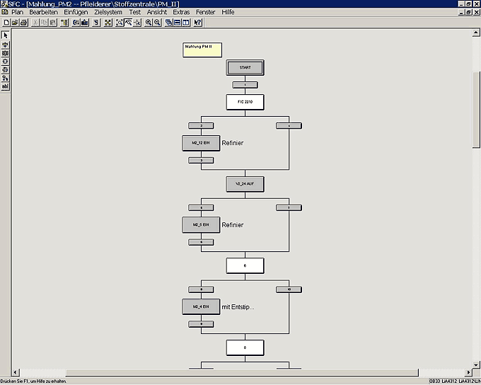 SFC is used for the graphic layout of discontinuous batch processes and facilitates easy editing of sequencers. The desired CFC module interfaces are selected by simple actions (like “drag & drop” and “fill in the blanks”) and interconnected with the sequencer transitions. The user is also supported by potent test and IBS functions as well as convenient editing functions. The graphic sequencer layout can be transferred to the user interface and serves the plant operator as a tool for analysis.